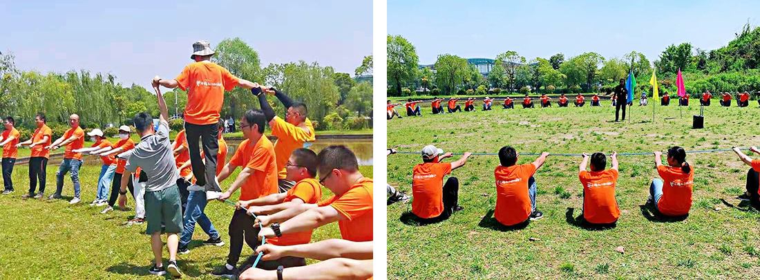 热身完成之后,团体游戏动力转圈也随后而来,我们手拉手围成一个富有张力的圆环,像极了我们在工作中团队中的共同平台,一个人的力量是渺小的,共同的力量是巨大的,六百个转圈在大家高昂激情的口号中也轻松的完成了。之后教练加大了游戏的难度,由四队各出一名成员站在麻绳上绕着走一圈,这极大的考验了团队协作的能力及互相之间的信任。选出的成员在上面走的同时,下方的同事会铆足了劲努力往后倾着身子,为了让绳子紧实的同时更加稳固,通过这个活动让我们明白了我们是一个团队,是一个值得彼此信赖的团体。