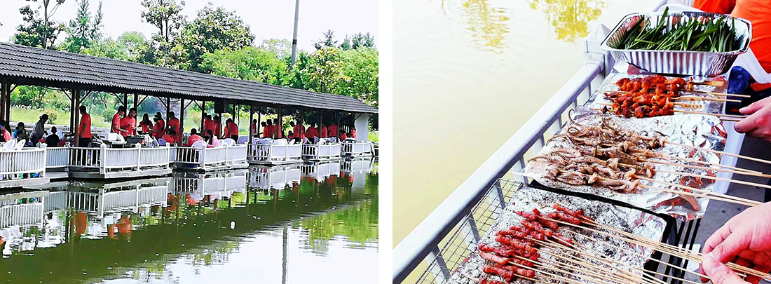 动力圈结束后就到了中午的烧烤时间,我们从草坪出发沿着营地湖边走到了湖上的水上长廊,坐在凉风习习的水中亭廊上,各式各样的烧烤食材齐齐摆上,公司里一个个隐藏的烧烤老师傅开始大显身手,金黄的鸡翅,油滋滋的五花肉,香喷喷的鱿鱼等一一出炉。同事们悠闲的坐在椅子上,吹着微风,吃着美味的食物,喝着爽口的饮料和酒,还有同事自制了工具用着烤好的食物去勾着湖里的小虾。
