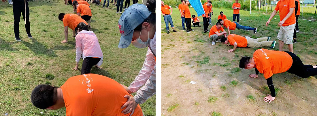 烧烤结束之后,就要开始下午的团队PK赛,四个队伍摩拳擦掌,气氛被哄托到最高点。最后的胜负是通过接下来的三个比赛所积累的积分来获得,分别是十人九足、挑战极限和鼓动人心三项。为了自己团队的胜利,大家铆足干劲想要发挥自己最大的力量。在下午的比赛中有人摔倒了,但是没有关系,爬起来,继续挑战,关键时刻不能給自己的队伍拖后腿,经过几轮积分赛,最终只有一支队伍获得了最后胜利,获得了奖品。但是其他三队的队长就要接受惩罚--俯卧撑,队长完成不了的,会有队友主动站出来替队长继续完成。在下午团建的最后,公司的所有员工在草坪上都排好拍下了合照,记录下了这一美好的时刻。